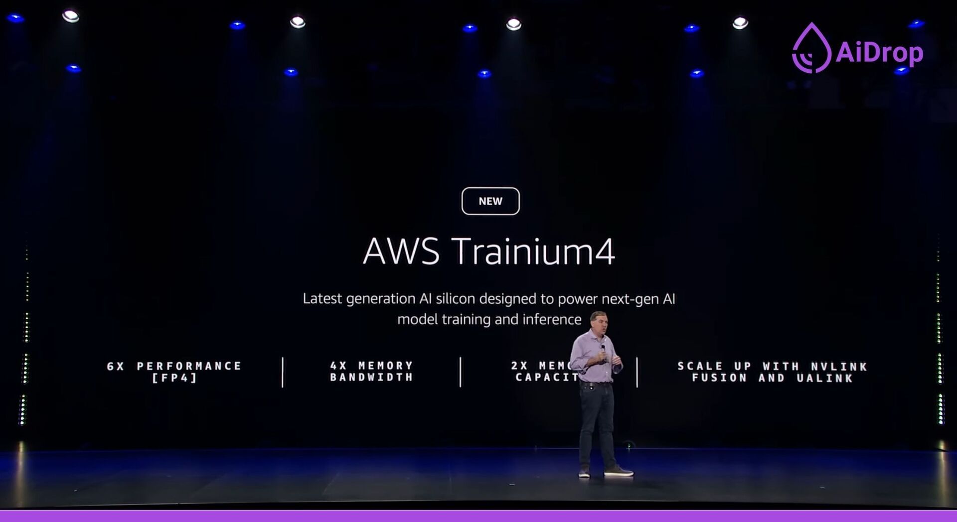 Deu um spoiler do Trainium4 previsto para 2026, com 6x mais performance e suporte ao Nvidia NVLink Fusion. Para agradar a Nvidia.